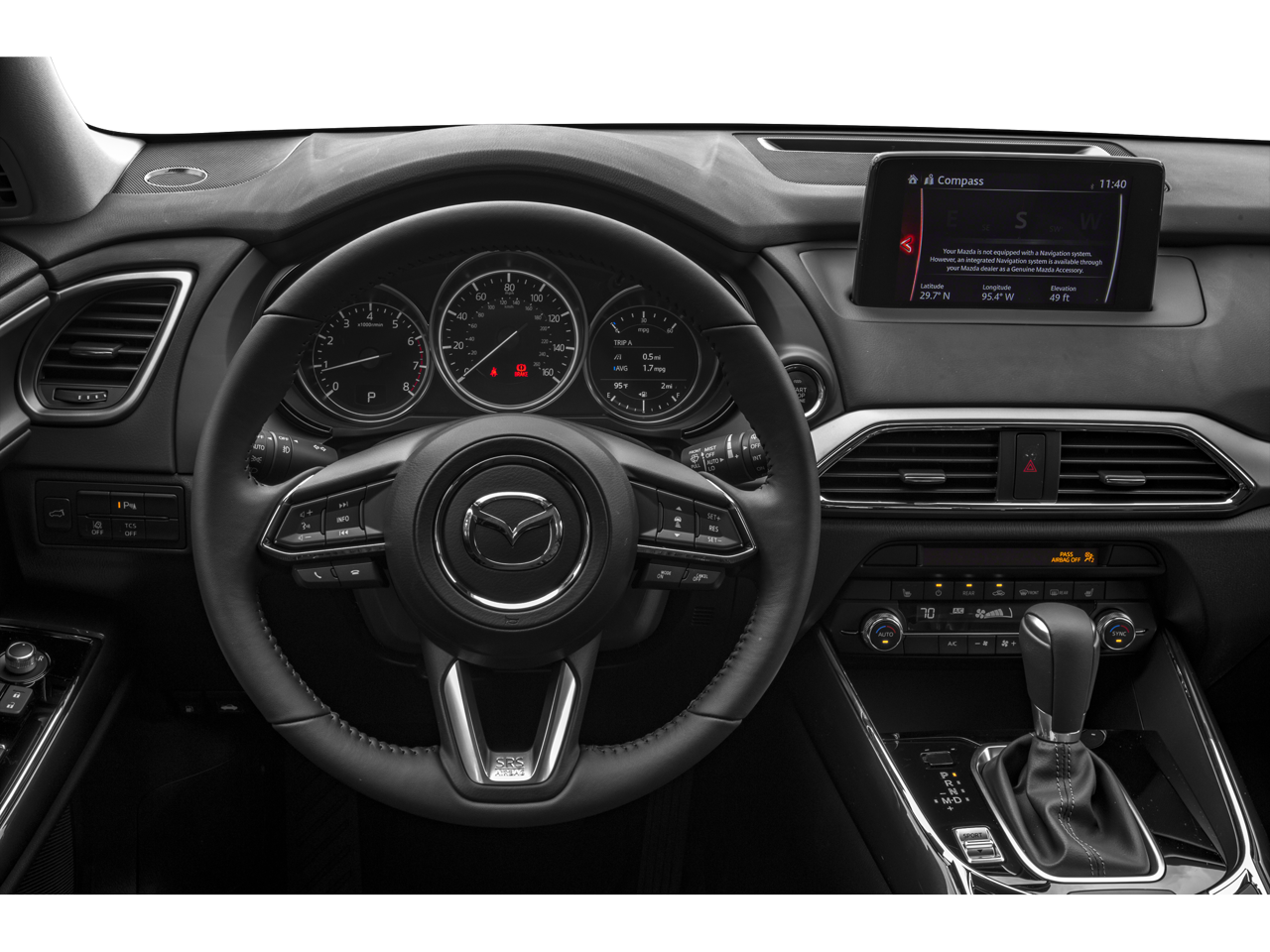 This Mazda CX-9 is well equipped with Touring Premium Package (2nd Row Retractable Window Sunshade, Bose Premium Audio w/12 speakers, Front Parking Sensor, LED Foglights, Mazda Navigation System, Power Sliding Glass Moonroof w/Interior Sunshade, Rear Backup Sensor, and SiriusXM Satellite Radio), 3rd row seats: bench, 4-Wheel Disc Brakes, 6 Speakers, ABS brakes, Aha Internet Radio, Air Conditioning, Alloy wheels, AM/FM radio, AppLink/Apple CarPlay and Android Auto, Auto High-beam Headlights, Auto-dimming Rear-View mirror, Automatic temperature control, Axle Ratio: 4.411, Brake assist, Bumpers: body-color, Compass, Delay-off headlights, Driver door bin, Driver vanity mirror, Dual front impact airbags, Dual front side impact airbags, E911 Automatic Emergency Notification, Electronic Stability Control, Emergency communication system: MAZDA CONNECT, Exterior Parking Camera Rear, Four wheel independent suspension, Front anti-roll bar, Front Bucket Seats, Front Center Armrest, Front dual zone A/C, Front reading lights, Fully automatic headlights, Garage door transmitter: HomeLink, Heated door mirrors, Heated Front Bucket Seats, Heated front seats, Illuminated entry, Infotainment System Voice Command, Leather Shift Knob, Leather steering wheel, Leather-Trimmed Seats, Low tire pressure warning, Occupant sensing airbag, Outside temperature display, Overhead airbag, Overhead console, Pandora Internet Radio, Panic alarm, Passenger door bin, Passenger vanity mirror, Power door mirrors, Power driver seat, Power Liftgate, Power passenger seat, Power steering, Power windows, Radio Broadcast Data System Program Information, Radio data system, Radio: AM/FM Sound System, Rain sensing wipers, Rear air conditioning, Rear anti-roll bar, Rear reading lights, Rear seat center armrest, Rear window defroster, Rear window wiper, Remote keyless entry, SMS Text Msg Audio Delivery & Reply, Speed control, Speed-sensing steering, Split folding rear seat, Spoiler, Steering wheel mounted audio controls, Stitcher Internet Radio, Tachometer, Telescoping steering wheel, Tilt steering wheel, Traction control, Trip computer, Turn signal indicator mirrors, Variably intermittent wipers, and Wheels: 18" x 8"J Aluminum Alloy.