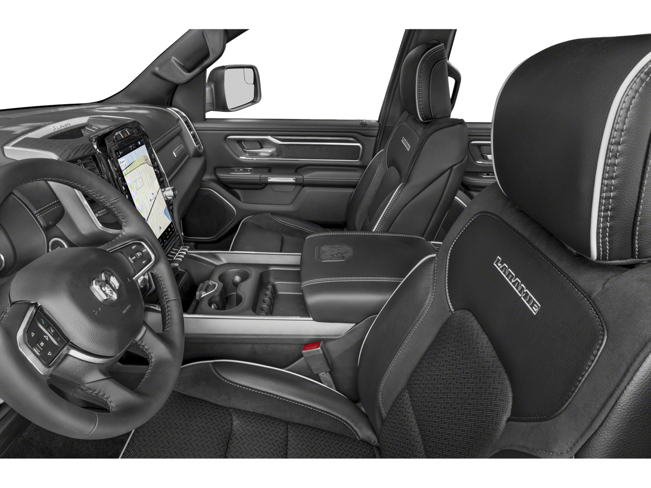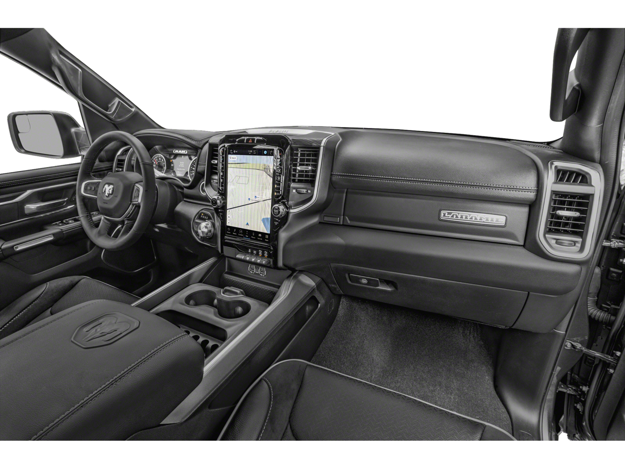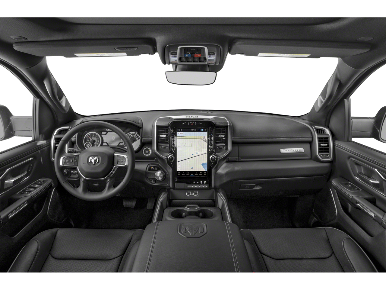 This 1500 is well equipped with Bed Utility Group (MOPAR 4 Adjustable Cargo Tie-Down Hooks, MOPAR Spray In Bedliner, and Pick-Up Box Lighting), Laramie Level 1 Equipment Group (12" Touchscreen Display, 2nd Row In Floor Storage Bins, 4G LTE Wi-Fi Hot Spot, Apple CarPlay, Auto High Beam Headlamp Control, Blind Spot & Cross Path Detection, Connected Travel & Traffic Services, Connectivity - US/Canada, Disassociated Touchscreen Display, Electric Shift-On-Demand Transfer Case, Foam Bottle Insert (Door Trim Panel), For Details, Visit DriveUconnect.com, For More Info, Call 800-643-2112, Front Door Accent Lighting, Front LED Fog Lamps, Global Telematics Box Module (TBM), Google Android Auto, GPS Antenna Input, GPS Navigation, HD Radio, Integrated Center Stack Radio, Integrated Voice Command w/Bluetooth®, LED Reflector Headlamps, Radio: Uconnect 5 Nav w/12.0" Display, Rain Sensitive Windshield Wipers, Rear Door Accent Lighting, Rear Power Sliding Window, Rear Window Defroster, Remote Tailgate Release, SiriusXM Radio Service, SiriusXM w/360L, and USB Host Flip), Quick Order Package 27H Laramie, #1 Seat Foam Cushion, 10 Speakers, 3 Rear Seat Head Restraints, 3.21 Rear Axle Ratio, 4 Way Front Headrests, 4-Wheel Disc Brakes, 48V Belt Starter Generator, ABS brakes, Adjustable pedals, Air Conditioning, Alloy wheels, AM/FM radio: SiriusXM with 360L, Apple CarPlay/Android Auto, Audio memory, Auto-dimming door mirrors, Auto-Dimming Exterior Driver Mirror, Auto-dimming Rear-View mirror, Automatic temperature control, Brake assist, Bumpers: chrome, Chrome Exterior Mirrors, Class IV Receiver Hitch, Compass, Convex Wide-Angle Exterior Mirror Insert, Delay-off headlights, Dome Dual LED Reading Lamp, Driver door bin, Driver Seat Memory, Driver vanity mirror, Dual front impact airbags, Dual front side impact airbags, Dual-Pane Panoramic Sunroof, Electronic Stability Control, Exterior Mirrors Courtesy Lamps, Exterior Mirrors w/Heating Element, Exterior Mirrors w/Memory, Exterior Mirrors w/Supplemental Signals, Front anti-roll bar, Front Center Armrest w/Storage, Front dual zone A/C, Front fog lights, Front License Plate Bracket, Front reading lights, Front Seat Back Map Pockets, Front wheel independent suspension, Fully automatic headlights, Garage door transmitter, Heated door mirrors, Heated Front Seats, Heated front seats, Heated Steering Wheel, Heated steering wheel, Illuminated entry, Leather steering wheel, Leather Trim 40/20/40 Bench Seat, LED Dome/Reading Lamp, Low tire pressure warning, Memory seat, MOPAR Front & Rear Rubber Floor Mats, Navigation System, Occupant sensing airbag, Outside temperature display, Overhead airbag, Overhead console, Panic alarm, ParkSense Front/Rear Park Assist w/Stop (DISC), ParkView Rear Back-Up Camera, Passenger door bin, Passenger vanity mirror, Pedal memory, Power 2-Way Driver Lumbar Adjust, Power 2-Way Passenger Lumbar Adjust, Power 8-Way Driver & Passenger Seats, Power door mirrors, Power driver seat, Power passenger seat, Power steering, Power windows, Power-Folding Mirrors, Radio data system, Radio: Uconnect 5 Nav w/8.4" Display, RAM Grille Badge - Chrome, Rear 60/40 Folding Seat, Rear anti-roll bar, Rear seat center armrest, Rear step bumper, Rear Wheelhouse Liners, Remote keyless entry, Security system, Speed control, Split folding rear seat, Steering wheel mounted audio controls, Tachometer, Telescoping steering wheel, Tilt steering wheel, Traction control, Trip computer, Turn signal indicator mirrors, Variably intermittent wipers, Ventilated Front Seats, Ventilated front seats, Voltmeter, Wheel to Wheel Side Steps, Wheels: 18" x 8" Aluminum Base Painted, and Wheels: 20" x 9" Premium Paint/Polished.