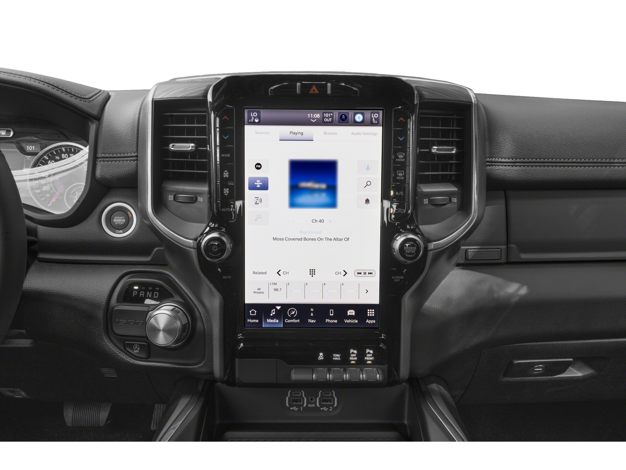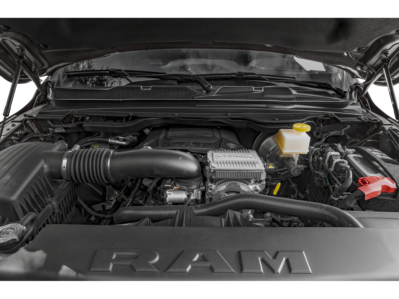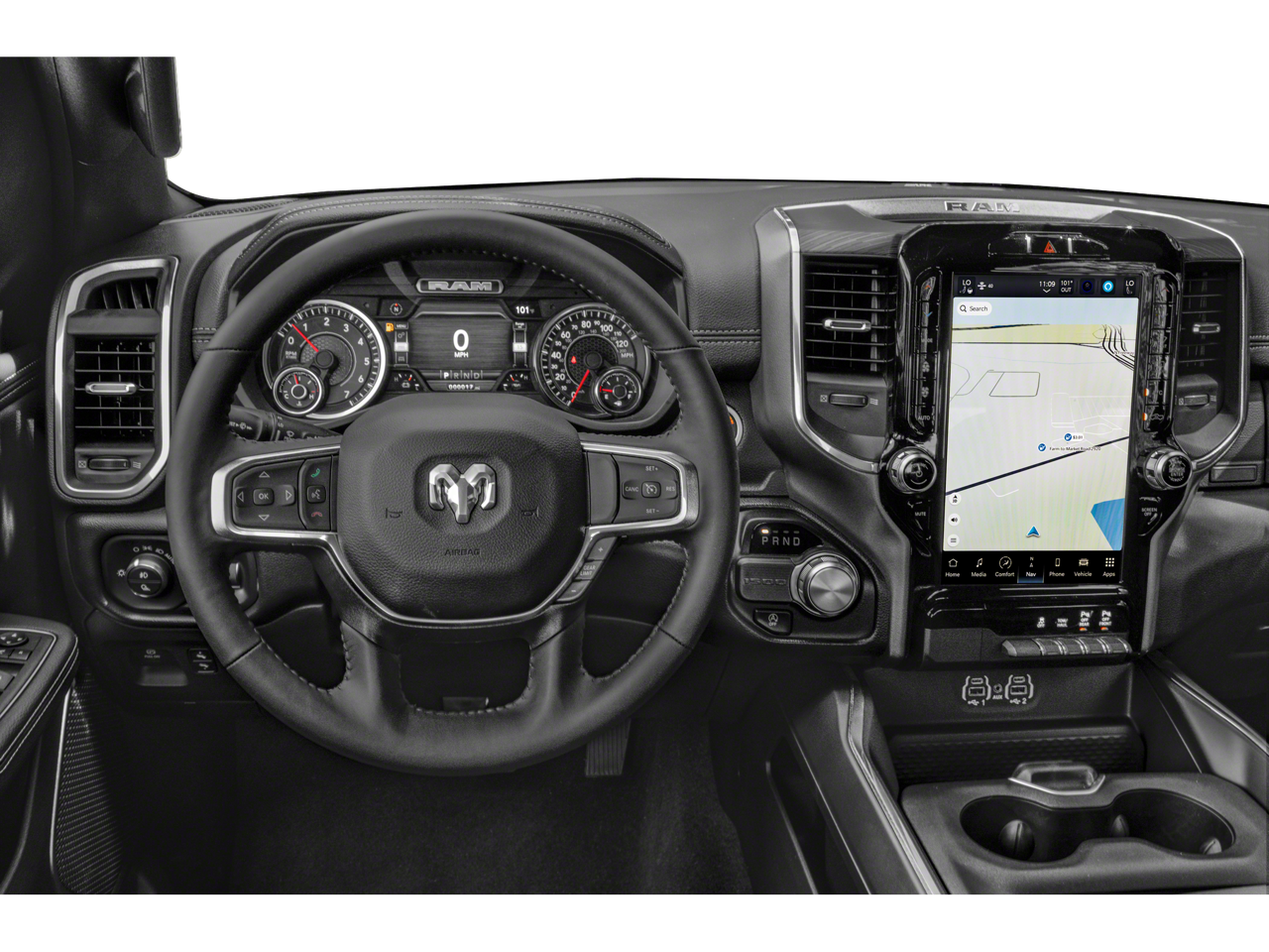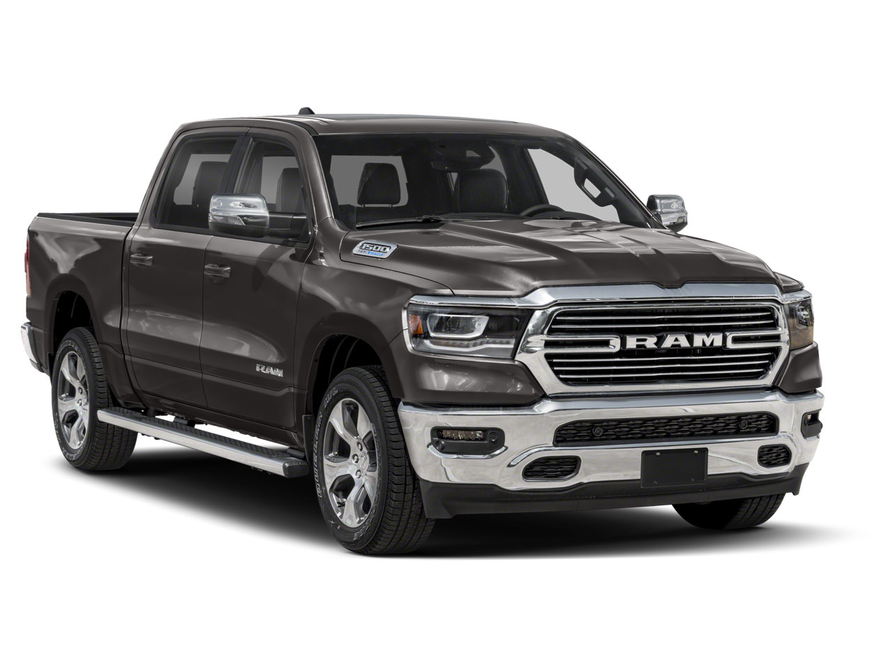 This 1500 is well equipped with Bed Utility Group (MOPAR 4 Adjustable Cargo Tie-Down Hooks, MOPAR Spray In Bedliner, and Pick-Up Box Lighting), Laramie Level 1 Equipment Group (12" Touchscreen Display, 2nd Row In Floor Storage Bins, 4G LTE Wi-Fi Hot Spot, Apple CarPlay, Auto High Beam Headlamp Control, Blind Spot & Cross Path Detection, Connected Travel & Traffic Services, Connectivity - US/Canada, Disassociated Touchscreen Display, Electric Shift-On-Demand Transfer Case, Foam Bottle Insert (Door Trim Panel), For Details, Visit DriveUconnect.com, For More Info, Call 800-643-2112, Front Door Accent Lighting, Front LED Fog Lamps, Global Telematics Box Module (TBM), Google Android Auto, GPS Antenna Input, GPS Navigation, HD Radio, Integrated Center Stack Radio, Integrated Voice Command w/Bluetooth®, LED Reflector Headlamps, Radio: Uconnect 5 Nav w/12.0" Display, Rain Sensitive Windshield Wipers, Rear Door Accent Lighting, Rear Power Sliding Window, Rear Window Defroster, Remote Tailgate Release, SiriusXM Radio Service, SiriusXM w/360L, and USB Host Flip), Quick Order Package 27H Laramie, #1 Seat Foam Cushion, 10 Speakers, 3 Rear Seat Head Restraints, 3.21 Rear Axle Ratio, 4 Way Front Headrests, 4-Wheel Disc Brakes, 48V Belt Starter Generator, ABS brakes, Adjustable pedals, Air Conditioning, Alloy wheels, AM/FM radio: SiriusXM with 360L, Apple CarPlay/Android Auto, Audio memory, Auto-dimming door mirrors, Auto-Dimming Exterior Driver Mirror, Auto-dimming Rear-View mirror, Automatic temperature control, Brake assist, Bumpers: chrome, Chrome Exterior Mirrors, Class IV Receiver Hitch, Compass, Convex Wide-Angle Exterior Mirror Insert, Delay-off headlights, Dome Dual LED Reading Lamp, Driver door bin, Driver Seat Memory, Driver vanity mirror, Dual front impact airbags, Dual front side impact airbags, Dual-Pane Panoramic Sunroof, Electronic Stability Control, Exterior Mirrors Courtesy Lamps, Exterior Mirrors w/Heating Element, Exterior Mirrors w/Memory, Exterior Mirrors w/Supplemental Signals, Front anti-roll bar, Front Center Armrest w/Storage, Front dual zone A/C, Front fog lights, Front License Plate Bracket, Front reading lights, Front Seat Back Map Pockets, Front wheel independent suspension, Fully automatic headlights, Garage door transmitter, Heated door mirrors, Heated Front Seats, Heated front seats, Heated Steering Wheel, Heated steering wheel, Illuminated entry, Leather steering wheel, Leather Trim 40/20/40 Bench Seat, LED Dome/Reading Lamp, Low tire pressure warning, Memory seat, MOPAR Front & Rear Rubber Floor Mats, Navigation System, Occupant sensing airbag, Outside temperature display, Overhead airbag, Overhead console, Panic alarm, ParkSense Front/Rear Park Assist w/Stop (DISC), ParkView Rear Back-Up Camera, Passenger door bin, Passenger vanity mirror, Pedal memory, Power 2-Way Driver Lumbar Adjust, Power 2-Way Passenger Lumbar Adjust, Power 8-Way Driver & Passenger Seats, Power door mirrors, Power driver seat, Power passenger seat, Power steering, Power windows, Power-Folding Mirrors, Radio data system, Radio: Uconnect 5 Nav w/8.4" Display, RAM Grille Badge - Chrome, Rear 60/40 Folding Seat, Rear anti-roll bar, Rear seat center armrest, Rear step bumper, Rear Wheelhouse Liners, Remote keyless entry, Security system, Speed control, Split folding rear seat, Steering wheel mounted audio controls, Tachometer, Telescoping steering wheel, Tilt steering wheel, Traction control, Trip computer, Turn signal indicator mirrors, Variably intermittent wipers, Ventilated Front Seats, Ventilated front seats, Voltmeter, Wheel to Wheel Side Steps, Wheels: 18" x 8" Aluminum Base Painted, and Wheels: 20" x 9" Premium Paint/Polished.