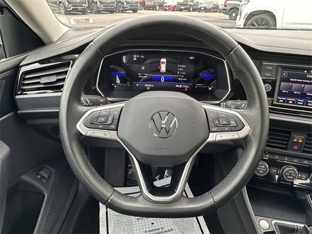 This Jetta is well equipped with Panoramic Sunroof Package (Dual Front Reading Lights, Illuminated Vanity Mirrors, Overhead Storage Compartment, and Power Tilting & Sliding Panoramic Sunroof), Volkswagen Certified Pre-Owned Certified, Titan Black Premium Synthetic, 4 Speakers, 4-Wheel Disc Brakes, ABS brakes, Active Blind Spot Monitor, Air Conditioning, Alloy wheels, AM/FM radio, Auto-dimming Rear-View mirror, Auto-Dimming Rearview Mirror w/HomeLink Connect, Automatic temperature control, Brake assist, Bumpers: body-color, Credit - Rear Sensors Removed, Delay-off headlights, Driver door bin, Driver vanity mirror, Dual front impact airbags, Dual front side impact airbags, Electronic Stability Control, Emergency communication system: VW Car-Net Safe & Secure 5-year, Exterior Parking Camera Rear, Front anti-roll bar, Front Bucket Seats, Front Center Armrest, Front dual zone A/C, Front wheel independent suspension, Fully automatic headlights, Heated door mirrors, Heated Front Comfort Sport Seats, Heated front seats, Heavy Duty Trunk Liner w/VW CarGo Blocks, Illuminated entry, Leather Shift Knob, Low tire pressure warning, Occupant sensing airbag, Outside temperature display, Overhead airbag, Overhead console, Panic alarm, Passenger door bin, Passenger vanity mirror, Power door mirrors, Power driver seat, Power steering, Power windows, Radio data system, Radio: MIB3 Composition Color w/6.5 Touchscreen, Rain sensing wipers, Rear anti-roll bar, Rear reading lights, Rear seat center armrest, Rear window defroster, Remote keyless entry, Rubber Monster Mats Kit (Set of 4), Speed control, Speed-sensing steering, Split folding rear seat, Steering wheel mounted audio controls, Tachometer, Telescoping steering wheel, Tilt steering wheel, Traction control, Trip computer, V-Tex Leatherette Seat Trim, Variably intermittent wipers, VW Car-Net Safe & Secure 5-Year Plan, VW Care, and Wheels: 17 Twin 5-Spoke Silver Painted Alloy.