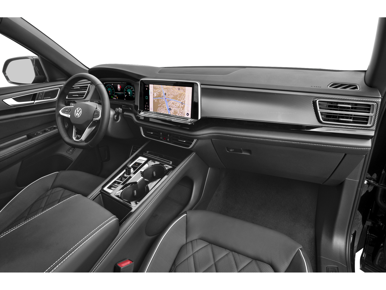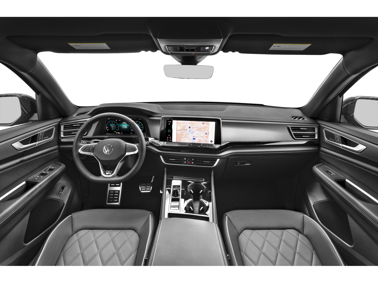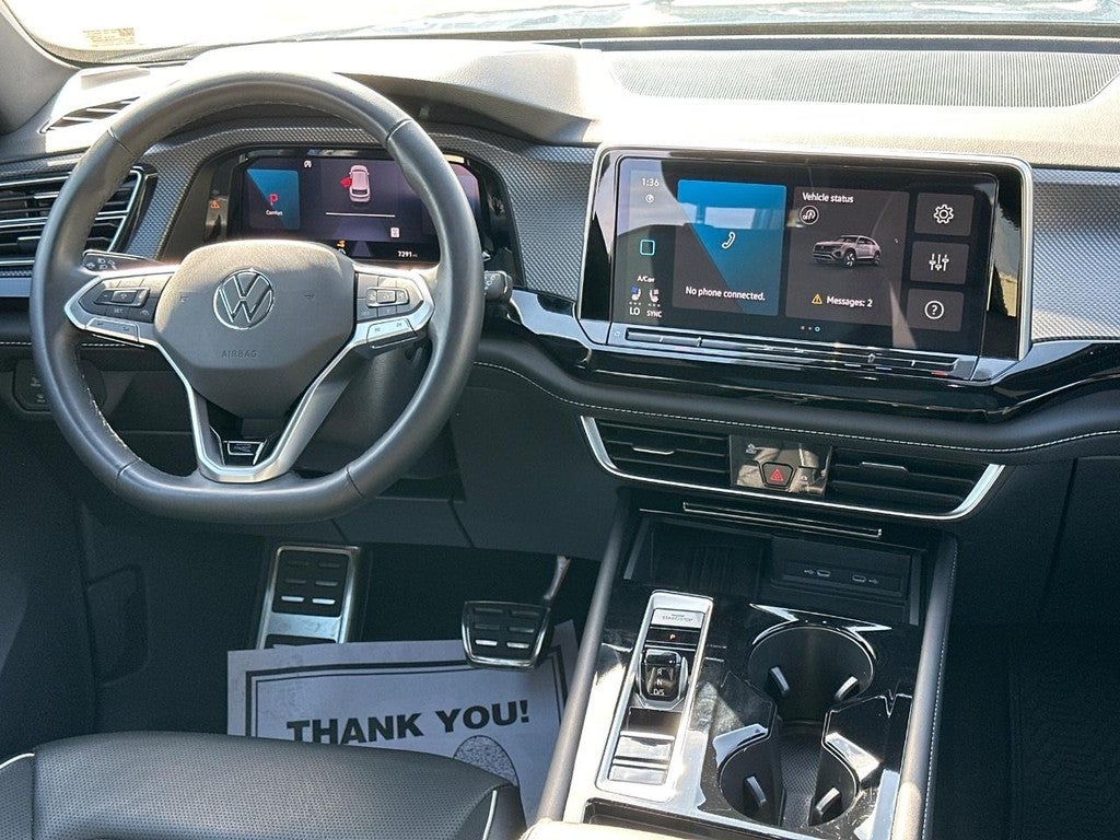 This Atlas Cross Sport is well equipped with 4-Wheel Disc Brakes, 4-Wheel Independent Suspension, 6 Speakers, ABS brakes, Air Conditioning, Alloy wheels, AM/FM radio: SiriusXM with 360L, Auto High-beam Headlights, Auto-dimming Rear-View mirror, Automatic temperature control, Brake assist, Bumpers: body-color, Compass, Delay-off headlights, Driver door bin, Driver vanity mirror, Dual front impact airbags, Dual front side impact airbags, Electronic Stability Control, Emergency communication system: VW Car-Net Safe & Secure 5-year, Exterior Parking Camera Rear, Four wheel independent suspension, Front anti-roll bar, Front Bucket Seats, Front Center Armrest, Front dual zone A/C, Front fog lights, Front reading lights, Fully automatic headlights, harman/kardon Speakers, Heads-Up Display, Heated & Actively Ventilated Front Seats, Heated door mirrors, Heated front seats, Heated rear seats, Heated steering wheel, Illuminated entry, Leather steering wheel, Low tire pressure warning, Memory seat, Navigation System, Occupant sensing airbag, Outside temperature display, Overhead airbag, Overhead console, Panic alarm, Passenger door bin, Passenger vanity mirror, Perforated Vienna Leather Seating Surfaces, Power door mirrors, Power driver seat, Power Liftgate, Power moonroof: Panoramic, Power passenger seat, Power steering, Power windows, Radio data system, Radio: MIB3 Discover Pro Navigation AM/FM/HD, Rain sensing wipers, Rear anti-roll bar, Rear audio controls, Rear reading lights, Rear seat center armrest, Rear window defroster, Rear window wiper, Remote keyless entry, Security system, Speed control, Speed-sensing steering, Split folding rear seat, Spoiler, Sport steering wheel, Steering wheel mounted audio controls, Tachometer, Telescoping steering wheel, Tilt steering wheel, Traction control, Trip computer, Turn signal indicator mirrors, Variably intermittent wipers, Ventilated front seats, and Wheels: 21" 2-Tone Machined Alloy.