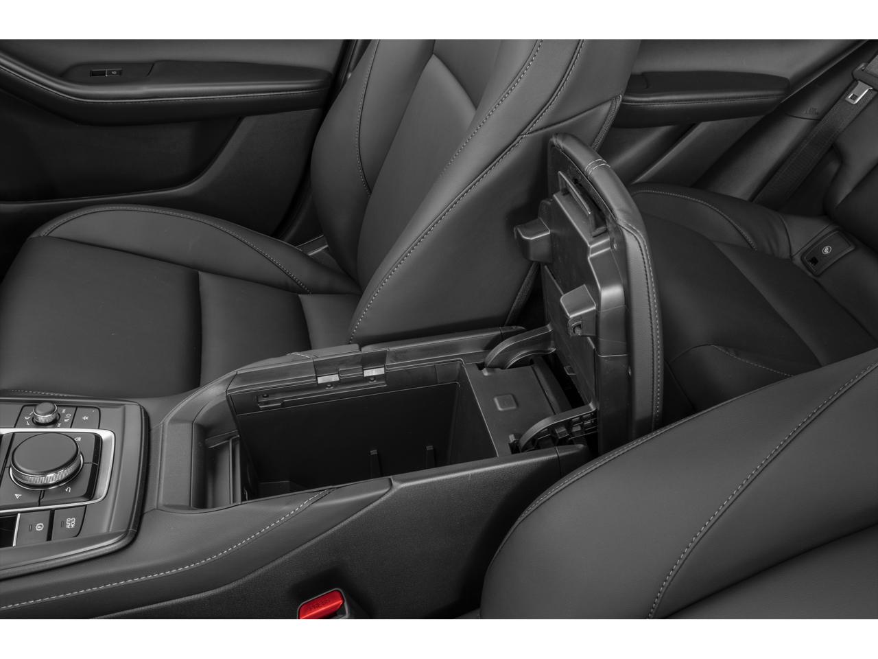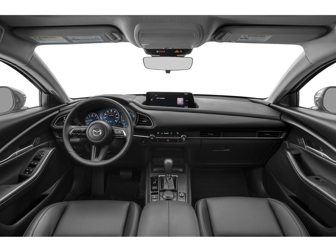 This Mazda CX-30 is well equipped with 4-Wheel Disc Brakes, 8 Speakers, ABS brakes, Air Conditioning, Alloy wheels, AM/FM radio, AppLink/Apple CarPlay and Android Auto, Auto High-beam Headlights, Automatic temperature control, Brake assist, Bumpers: body-color, Cargo Tray, Compass, Delay-off headlights, Driver door bin, Driver vanity mirror, Dual front impact airbags, Dual front side impact airbags, Electronic Stability Control, Emergency communication system: MAZDA CONNECT, Exterior Parking Camera Rear, Front anti-roll bar, Front Bucket Seats, Front Center Armrest, Front dual zone A/C, Front reading lights, Front wheel independent suspension, Fully automatic headlights, Heated door mirrors, Heated Front Bucket Seats, Heated front seats, High Wall All-Weather Floor Mats, Illuminated entry, Knee airbag, Leather Shift Knob, Leather steering wheel, Leatherette Seat Trim, Low tire pressure warning, MAZDA CONNECT Infotainment System, Memory seat, Occupant sensing airbag, Outside temperature display, Overhead airbag, Overhead console, Panic alarm, Passenger door bin, Passenger vanity mirror, Power door mirrors, Power driver seat, Power moonroof, Power steering, Power windows, Radio data system, Radio: AM/FM Audio System, Rain sensing wipers, Rear seat center armrest, Rear side impact airbag, Rear window defroster, Rear window wiper, Remote keyless entry, Snowflake White Pearl Mica Paint Charge, Speed control, Speed-sensing steering, Split folding rear seat, Spoiler, Steering wheel mounted audio controls, Tachometer, Telescoping steering wheel, Tilt steering wheel, Traction control, Trip computer, Turn signal indicator mirrors, Variably intermittent wipers, Wheel Locks, and Wheels: 18" x 7J Aluminum Alloy.